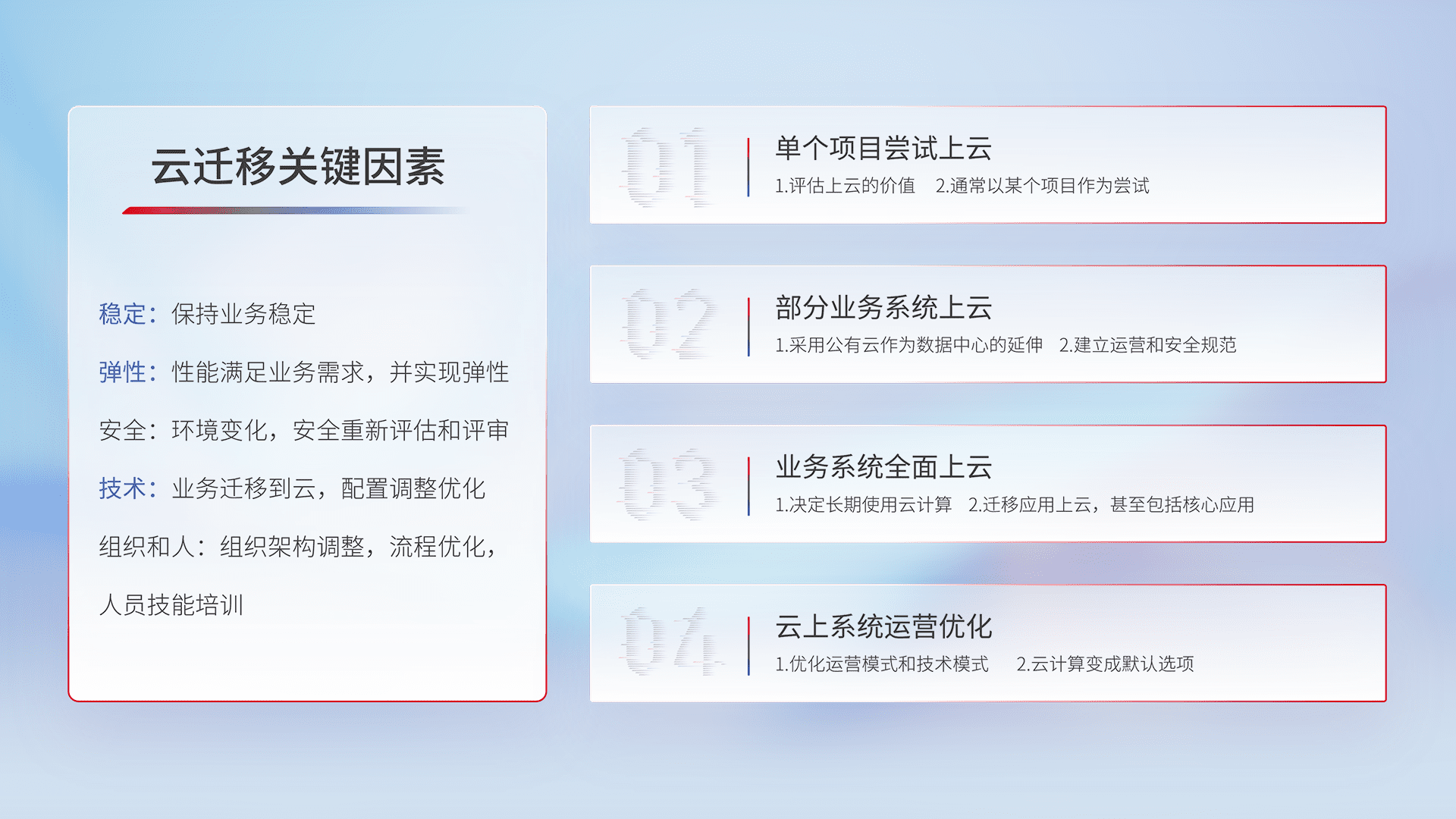 结合实际业务,,从规划设计、、云平台选型、、云原生改造、、、数据迁移、、、、集成交付,,,,迁移全过程为客户识别最佳上云路径,,,,做好风险识别管理,,,设计网络架构、、、身份权限、、安全审计合规、、、、操作审计、、、、日志审计、、、、监控告警策略、、多站点容灾设计等,,对云上基础设施进行整体规划,,,提升IT治理水平,,,,以满足弹性、、、、高可用、、、、高性能的需求。。