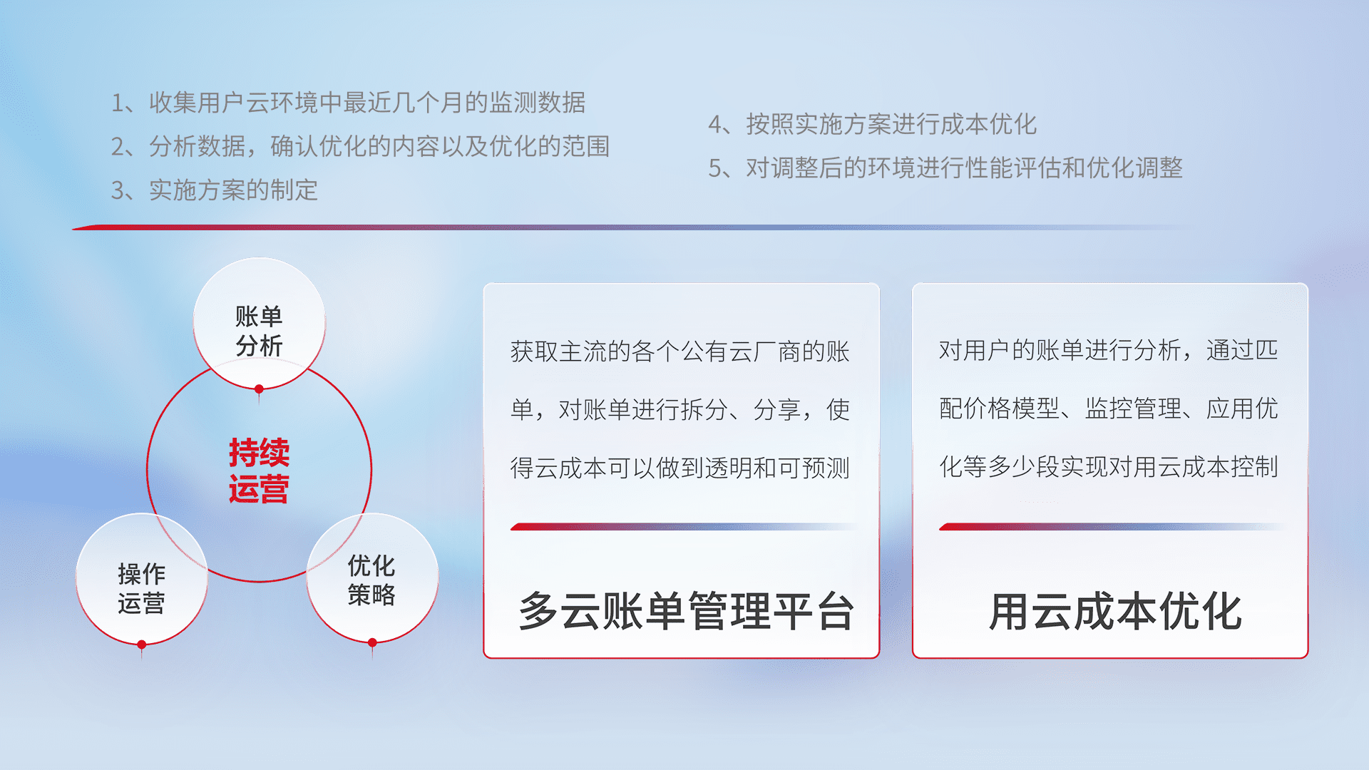 通过多云纳管,,,以统一的资源数据模型把客户的云资源进行抽象和封装,,,进而实现对多云资源的统一操作,,,保障云资源管理的可靠性、、、、稳定性与可用性。。。。量身定制化运维内容,,,配置、、、开发运维、、补丁管理、、备份、、、监控、、、、认证和访问管理、、、、审计和日常巡检等,,,保障在用云过程中的可靠度,,,稳定度以及高可用率。。。。
